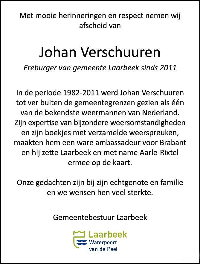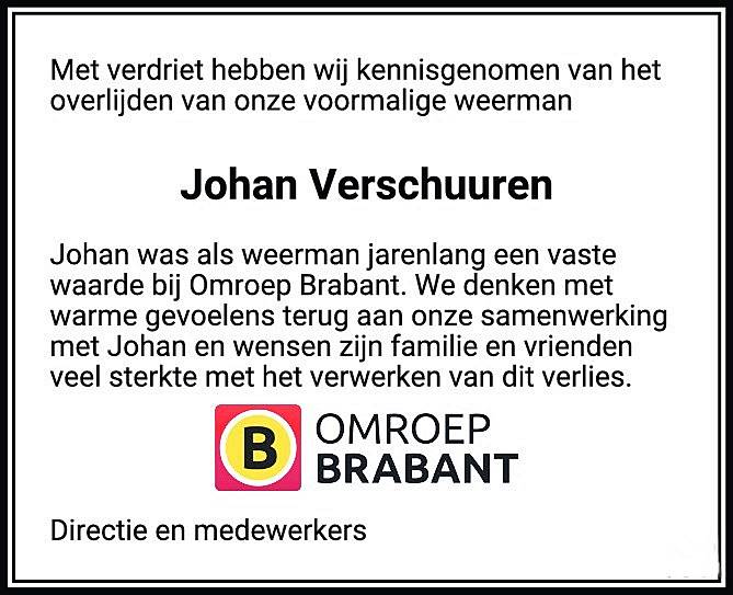 De legendarische weerman Johan Verschuuren, de man die dertig jaar lang het weer voorspelde in Brabant, is donderdag 21 januari 2021 op 85-jarige leeftijd aan een hartaanval overleden. Dat heeft zijn vrouw Gerrie laten weten.